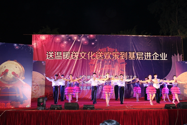 晚上,自治區(qū)總工會(huì)安排了豐富多彩的慰問演出。整場(chǎng)演出以“勞動(dòng)托起中國(guó)夢(mèng)”為主題,載歌載舞,奏響勞動(dòng)光榮的時(shí)代主旋律。慰問演出在富有壯族文化風(fēng)情的《廣西尼的呀》的舞蹈中拉開了序幕,既有《力與美》的高難度雜技表演,又有詼諧幽默、勵(lì)志感人的小品《為愛加油》,配樂詩朗誦《心儀廣西》展示了廣西壯鄉(xiāng)的山好水好前景闊,更有優(yōu)美的舞蹈《魅影》、《工匠精神》等節(jié)目更是歌頌了勞動(dòng)之美。路橋集團(tuán)員工還帶來配樂詩朗誦《萬里征程品為本,行穩(wěn)致遠(yuǎn)前景闊》和小品《工地愛情故事》,展現(xiàn)了路橋職工的風(fēng)采。慰問演出在歌舞《不忘初心》中畫上了圓滿的句號(hào),路橋建設(shè)者們?cè)谶@場(chǎng)文化盛宴中度過一個(gè)難忘的夜晚。