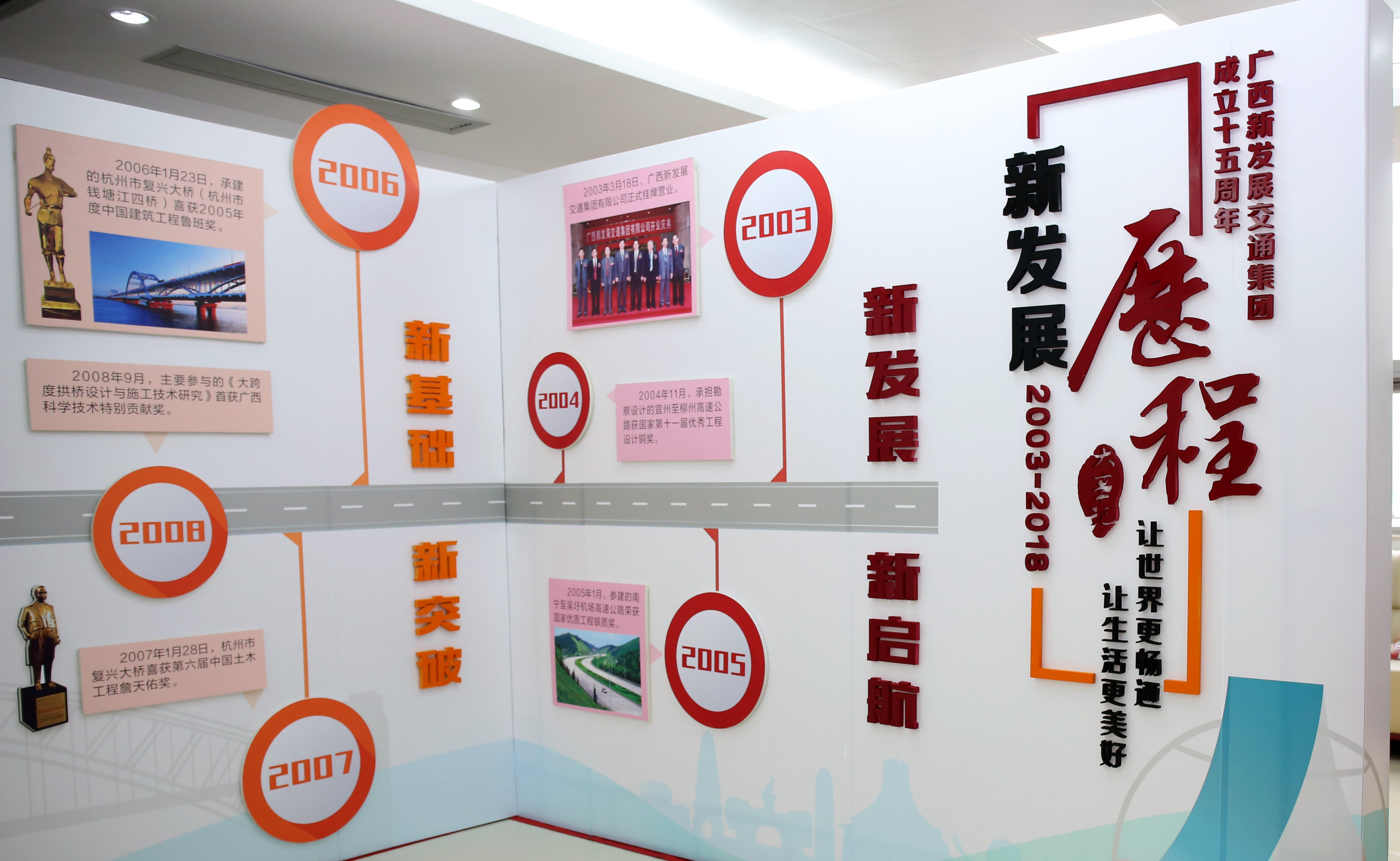 在活動現(xiàn)場入口處,設置有一面企業(yè)發(fā)展歷程墻,展示了歷年來集團公司發(fā)展取得的矚目成績?;顒娱_始后首先播放了《新時代 新發(fā)展 新征程》——廣西新發(fā)展交通集團15周年紀錄片,對15年發(fā)展史進行了有聲有色的回顧。