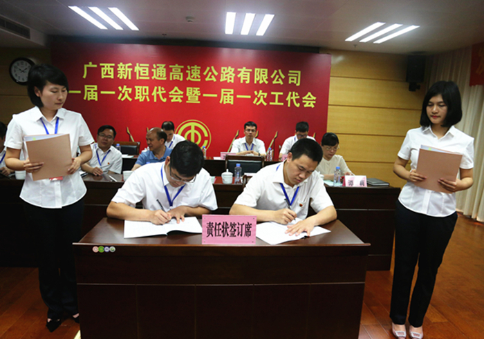 4月4日上午,新恒通公司一屆一次職代會暨一屆一次工代會勝利召開。會議全面貫徹落實黨的十九大及全國、全區(qū)交通工作會議和集團公司2018年工作會議精神,全面總結公司成立三年來的工作,明確和部署2018年各項重點工作,共謀公司發(fā)展大計,為奮力開創(chuàng)新時代“縣縣通”高速公路建設事業(yè)新局面而努力奮斗。集團公司領導出席會議并發(fā)表講話,集團公司派駐監(jiān)事會成員、41名正式代表、3名列席代表參加會議。公司黨委副書記、工會主席梁波主持會議。